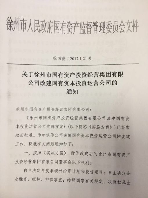 二、1月24日,市國資委印發(fā)《關(guān)于徐州市國有資產(chǎn)投資經(jīng)營集團有限公司改建國有資本投資運營公司的通知》,集團公司被確定為徐州首家國有資本投資運營公司試點企業(yè)。